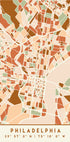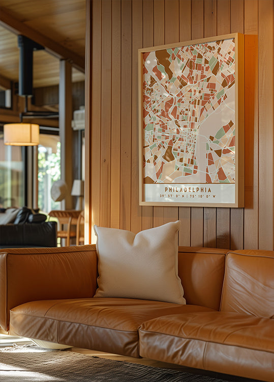 Black Maps Earth Tones 65 de Emiliano Deificus combina uma grade de ruas detalhada da Filadélfia com tons terrosos profundos. As linhas pretas desenham a estrutura vibrante da cidade, enquanto os tons quentes criam um contraste calmo. Um poster gráfico e moderno que eleva a sala de estar e o escritório com elegância urbana. Perfeito para uma estética simples e nórdica.