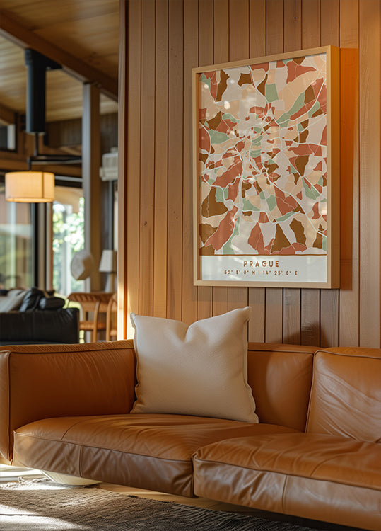 Um pôster atmosférico do mapa de Praga, onde o fundo preto e os tons terrosos destacam o ritmo da cidade. As ruas sinuosas e as curvas suaves do Vltava desenham um padrão gráfico elegante. Criada por Emiliano Deificus, que une modernidade e história numa expressão urbana atemporal. Uma expressão calma e minimalista em tons terrosos.