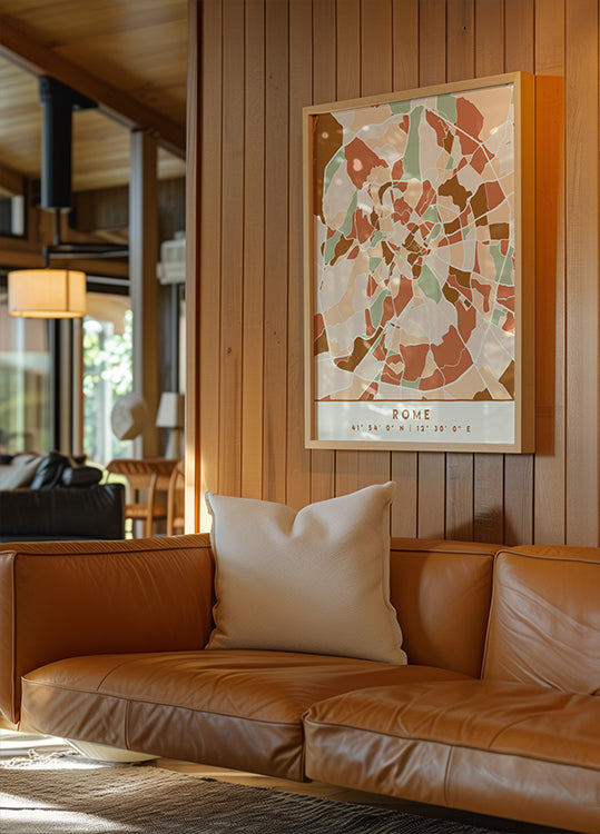 Um evocativo mapa da cidade de Roma em tons de terra: densas redes de ruas, elegantes linhas de rios e bairros distintos desenhados em campos pretos profundos e tons quentes e suaves. Emiliano Deificus combina precisão gráfica e calma poética numa expressão minimalista que eleva tanto os espaços modernos como os clássicos. Perfeito para chamar a atenção na sala de estar, no escritório ou no hall de entrada.