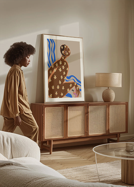Uma obra de arte vibrante e figurativa que retrata uma forma humana coberta de margaridas florescendo. Os tons terrosos da figura contrastam com linhas azuis brilhantes, que agregam movimento e energia. Uma obra única e expressiva de inspiração botânica que combina flores e expressão humana, perfeita para interiores modernos.