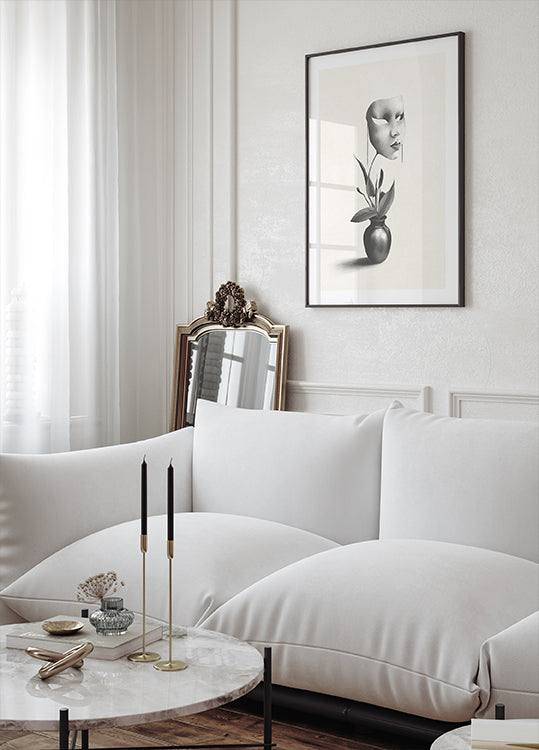 Uma ilustração surreal em preto e branco de uma misteriosa máscara flutuante crescendo a partir do caule de um vaso de planta. A combinação de elementos orgânicos e artificiais cria um contraste marcante e evoca temas como identidade, transformação e emoções ocultas. Um complemento perfeito para arte conceitual e interiores modernos.