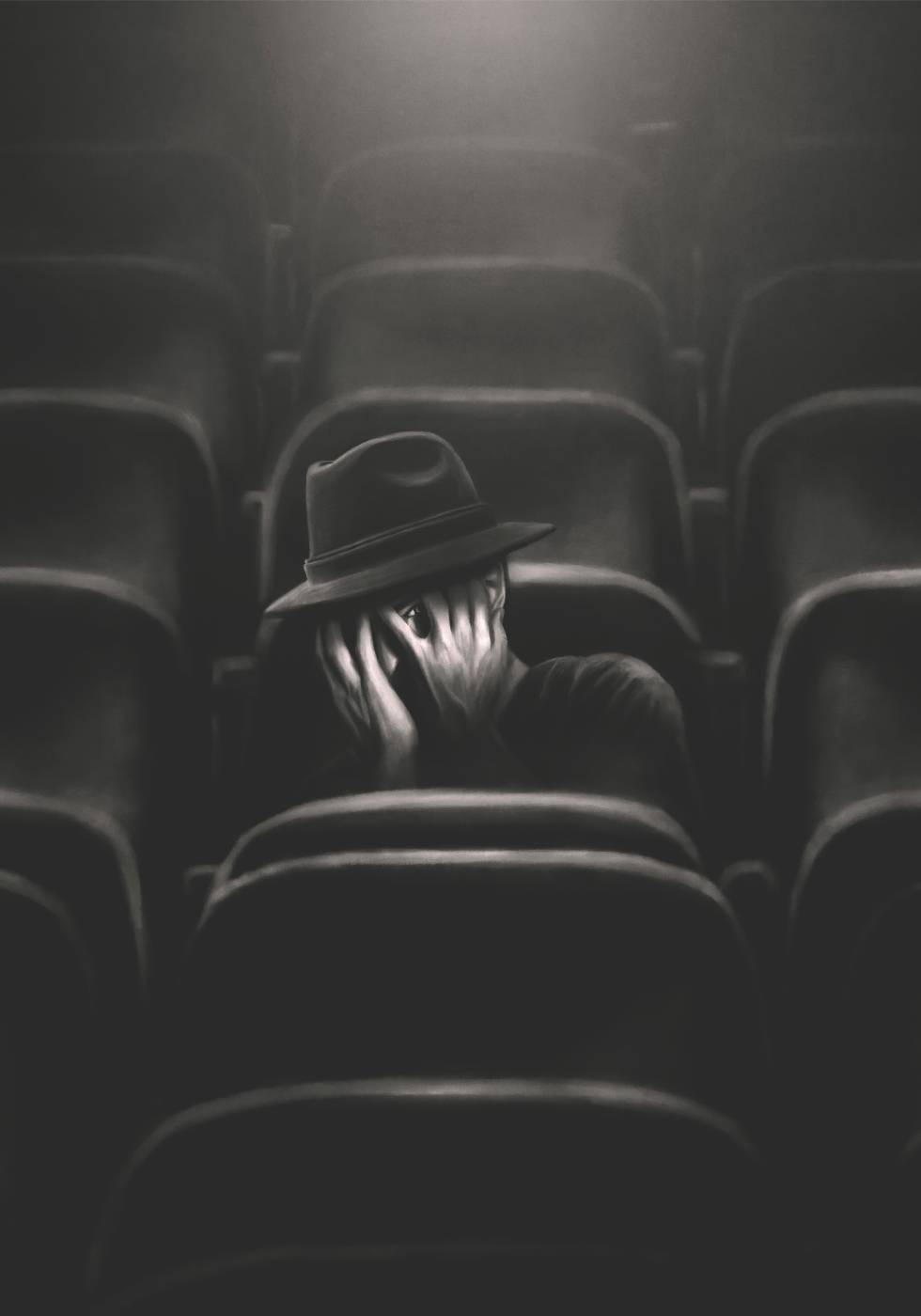 Uma obra intensa, em preto e branco, que mostra um homem sozinho em um cinema vazio, com a cabeça enterrada nas mãos e um olho espreitando para fora. Um símbolo de ansiedade, vigilância e solidão existencial.