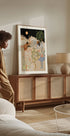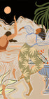 Pôster de dança ao luar captura um momento de pura alegria e liberdade enquanto duas mulheres se movem graciosamente sob o brilho quente da lua cheia. Com uma paleta sonhadora de tons terrosos de bege, preto profundo e verde exuberante, a natureza se une à expressiva forma humana. Linhas soltas e pictóricas e sombreados texturizados conferem ao trabalho uma qualidade dinâmica, quase etérea. Tecidos fluidos com listras e padrões de folhas balançam com movimento, enquanto as plantas ao redor e uma urna clássica acrescentam elegância. Esta obra de arte exala um espírito despreocupado e serve como uma peça central impressionante em interiores boêmios, modernos ou inspirados na natureza.