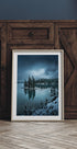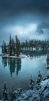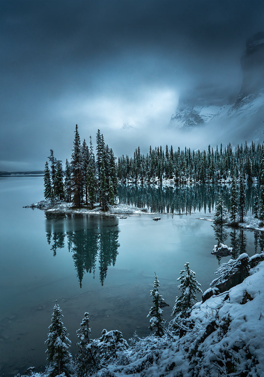 Uma evocativa paisagem de inverno ao amanhecer do artista Bing Li: a neblina paira sobre um lago espelhado e coberto de gelo, onde se refletem as silhuetas dos abetos e das montanhas cobertas de neve. O céu frio muda de um azul profundo para um rosa suave. Uma cena calma e poética que convida à contemplação e à reflexão tranquila. Perfeito para o clima de inverno.
