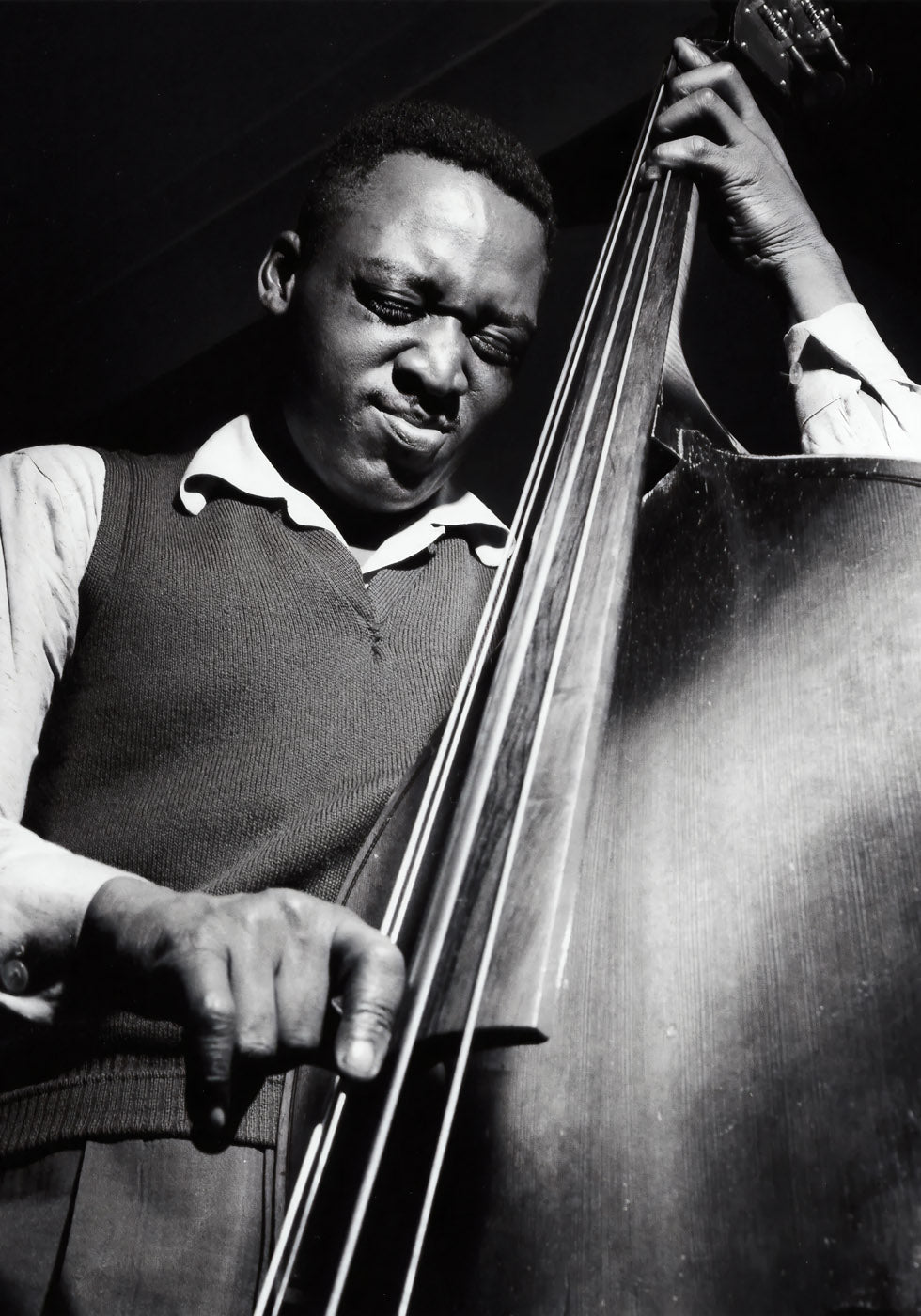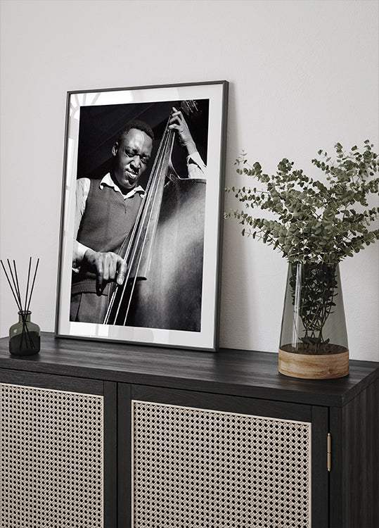 Uma poderosa fotografia em preto e branco que captura a paixão e a intensidade de um músico de jazz tocando contrabaixo. A iluminação dramática e a composição expressiva enfatizam o vínculo profundo entre o artista e seu instrumento. Um tributo atemporal ao jazz, à música e à expressão artística — perfeito para amantes da música e entusiastas da fotografia vintage.