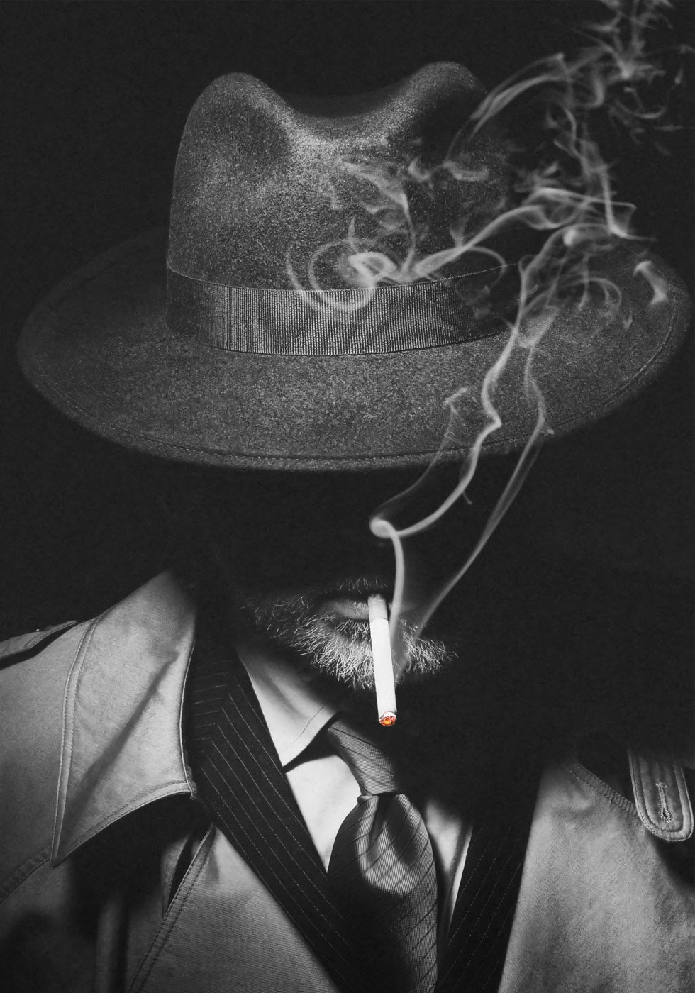 Um dramático retrato em preto e branco de um homem misterioso com um chapéu Fedora e um sobretudo exalando fumaça de cigarro. A iluminação profunda e as sombras criam uma atmosfera noir clássica que lembra os antigos filmes de detetive de Hollywood. Perfeito para os amantes do filme noir, histórias de crimes vintage e motivos cinematográficos atemporais.