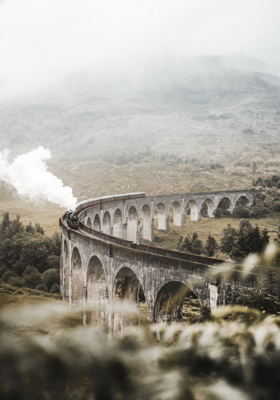 Uma fotografia de tirar o fôlego de um trem a vapor atravessando um viaduto histórico cercado por paisagens montanhosas enevoadas. A ponte curva de pedra cria uma sensação de aventura e nostalgia. Um pôster ideal para amantes de viagens e fãs de ferrovias.