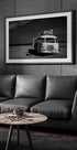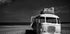 Uma fotografia evocativa em preto e branco de um ônibus vintage abandonado encalhado em uma praia arenosa. Com malas gastas empilhadas no telhado e o mar ao fundo, a imagem expressa viagens abandonadas, decadência e passagem do tempo.