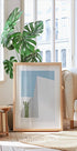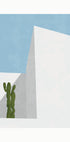 Esta obra de arte minimalista captura a tranquilidade do deserto com altos cactos verdes ao lado da arquitetura branca moderna. As linhas limpas, as sombras sutis e o céu azul claro criam uma composição pacífica que adiciona uma atmosfera quente e ensolarada ao seu espaço. Perfeito para quem aprecia beleza simples e estruturada e cores suaves e naturais.