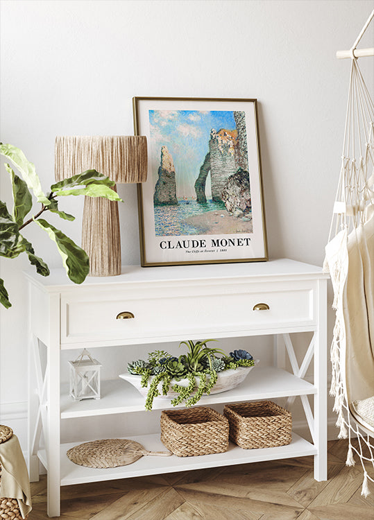 Uma pintura impressionista de tirar o fôlego de Claude Monet retratando as icônicas falésias de Étretat. Com suas pinceladas características e cores que refletem a luz, esta paisagem marítima clássica captura a beleza crua da natureza. Perfeito para amantes da arte e admiradores de Monet.