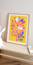 Um pôster feliz e motivacional com duas pombas brancas voando entre fortes folhas rosa e flores azuis em um fundo amarelo vibrante. A tipografia lúdica “Glow with the Flow” adiciona uma mensagem edificante de positividade e alegria. Perfeito para trazer boas vibrações para qualquer ambiente.