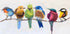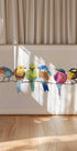 Uma obra de arte lúdica e pitoresca de seis pássaros coloridos sentados juntos em um galho. Cada pássaro é pintado de forma única com pinceladas ousadas de azul, verde, amarelo, vermelho e marrom, criando uma composição viva e expressiva. Perfeito para adicionar charme e criatividade a qualquer parede.