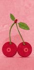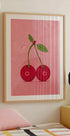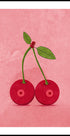 Uma ilustração lúdica e animada de duas cerejas com folhas em um fundo rosa texturizado. Ousado, divertido e colorido – este design traz um novo sopro de humor às cozinhas, salas de jantar ou interiores modernos e é uma declaração peculiar para quem adora arte inspirada em frutas.