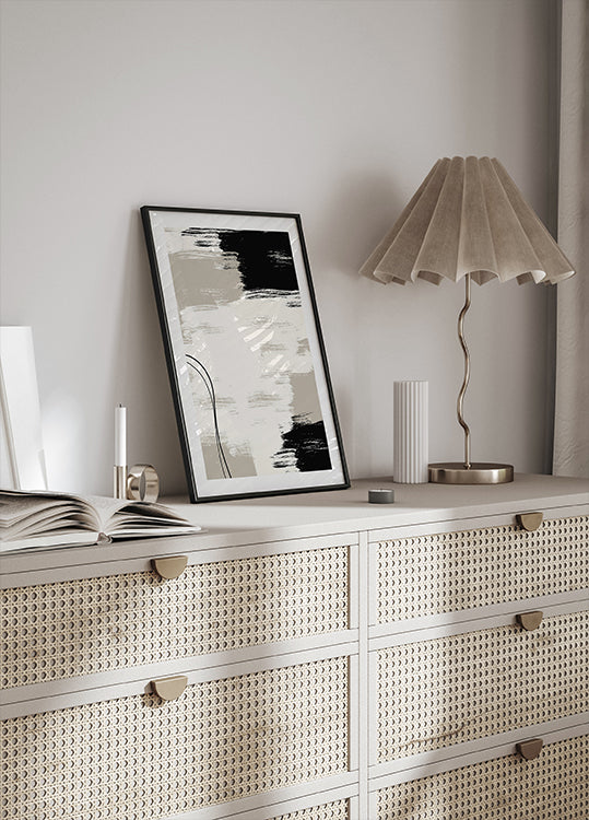 Uma pintura abstrata moderna com pinceladas ousadas em preto, branco e bege. A composição texturizada traz uma sensação de equilíbrio e expressão artística a qualquer interior. Perfeito para minimalistas e amantes da arte.