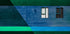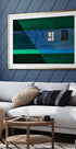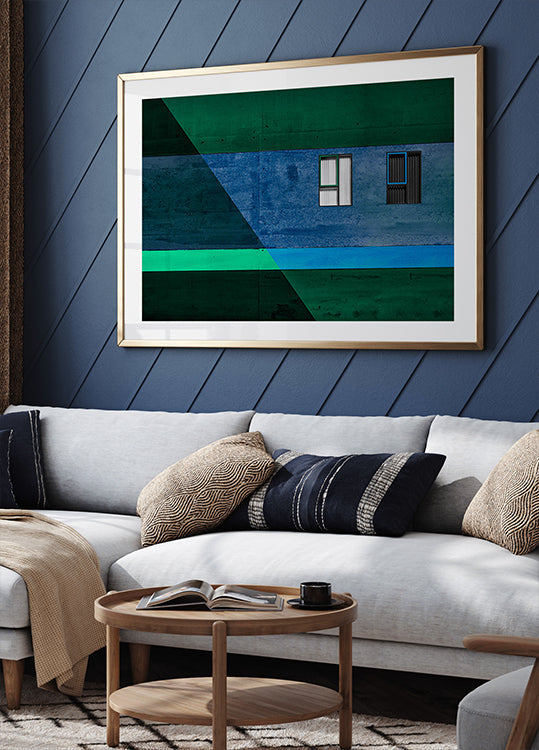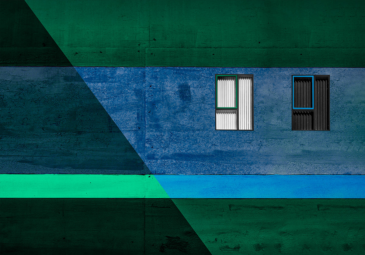 Uma arrojada obra de arte arquitetônica com duas janelas com ousadas persianas em preto e branco, colocadas contra uma parede texturizada em azuis e verdes profundos. As linhas nítidas e a composição geométrica criam uma obra abstrata moderna cheia de equilíbrio, contraste e excitação visual.