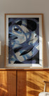 Um pôster abstrato dinâmico com pinceladas amplas em tons de azul, preto e branco. O fluxo energético das texturas cria uma sensação de ritmo e movimento, unindo a expressão contemporânea com a elegância pictórica - perfeito para interiores escandinavos, decoração moderna ou impressionantes paredes de galerias.
