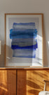 Um pôster abstrato relaxante com pinceladas horizontais em camadas em tons de azul e cinza contra um fundo branco puro. A textura pictórica e as transições suaves criam uma sensação de calma e profundidade - perfeita para interiores modernos, decoração escandinava ou paredes de galerias minimalistas.