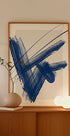 Um pôster moderno de arte abstrata com fortes pinceladas azuis sobre um fundo claro. Os traços dinâmicos criam movimento e textura, tornando-o um trabalho surpreendentemente minimalista, perfeito para interiores modernos.