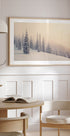 Uma poética cena de paisagem de inverno se desenrola: pinheiros cobertos de neve se erguem enquanto finos flocos de neve caem silenciosamente no crepúsculo azul-acinzentado. Linhas e camadas criam profundidade que conduz o olhar para a floresta e evoca uma melancolia calma e nórdica – tranquila, fresca e encantadora. Perfeito para criar uma tranquilidade invernal na sala de estar.
