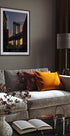 Uma vista deslumbrante da Ponte de Manhattan no Brooklyn, Nova York, capturada ao pôr do sol com o Empire State Building perfeitamente enquadrado entre os arcos de aço. Este icônico pôster da cidade destaca a beleza arquitetônica e a atmosfera urbana de Nova York, tornando-o obrigatório para os viajantes e para a decoração moderna da casa.