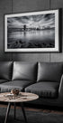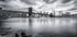 Uma dramática paisagem urbana em preto e branco da Ponte do Brooklyn que atravessa o Rio Hudson, com o icônico horizonte de Manhattan ao fundo. As nuvens evocativas e a longa exposição da água criam uma atmosfera cinematográfica atemporal que captura a essência de Nova York.