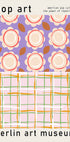 Um pôster de Pop Art ousado e colorido inspirado na exposição Berlin Kunstmuseum de 1950-1960. Com formas florais vibrantes e padrões de grade geométrica, o design reflete o poder da cultura pop americana em repetição. Perfeito para interiores retrô e modernos.