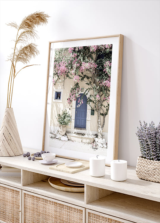 Uma encantadora paisagem mediterrânea com uma porta azul vibrante cercada por buganvílias rosa exuberantes em uma fachada bege ensolarada. Este motivo idílico captura a essência das ilhas gregas e é perfeito para uma casa que busca uma atmosfera acolhedora e tranquila.