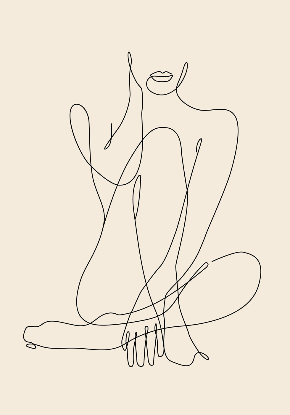 Um desenho elegante e artístico de uma mulher sentada, com apenas uma linha, expressando a beleza feminina e o estilo minimalista. As linhas simples, porém expressivas, criam um visual moderno e sofisticado, perfeito para decoração contemporânea e escandinava.