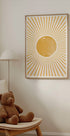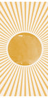 Esta obra de arte apresenta um design minimalista em forma de raio de sol com um círculo central que irradia linhas retas criando um padrão geométrico ousado. O uso de cores quentes confere um toque retrô e vintage, perfeito para decoração moderna e expressão artística.