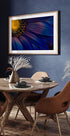Uma fotografia macro impressionante de uma flor em tons azuis e roxos profundos com um centro amarelo vibrante. Os finos detalhes nas pétalas, no pólen e nas texturas criam um close-up íntimo e artístico que irradia elegância e calor de verão.
