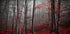 Uma cena de floresta misteriosa e surreal onde o chão está coberto de folhas vermelhas profundas que parecem um rio sangrento. A atmosfera enevoada e os troncos de árvores distintos contrastam dramaticamente com o vermelho intenso, criando uma obra de arte escura, mas atraente, inspirada no outono. Perfeito para quem gosta de arte de parede surreal e atmosférica.