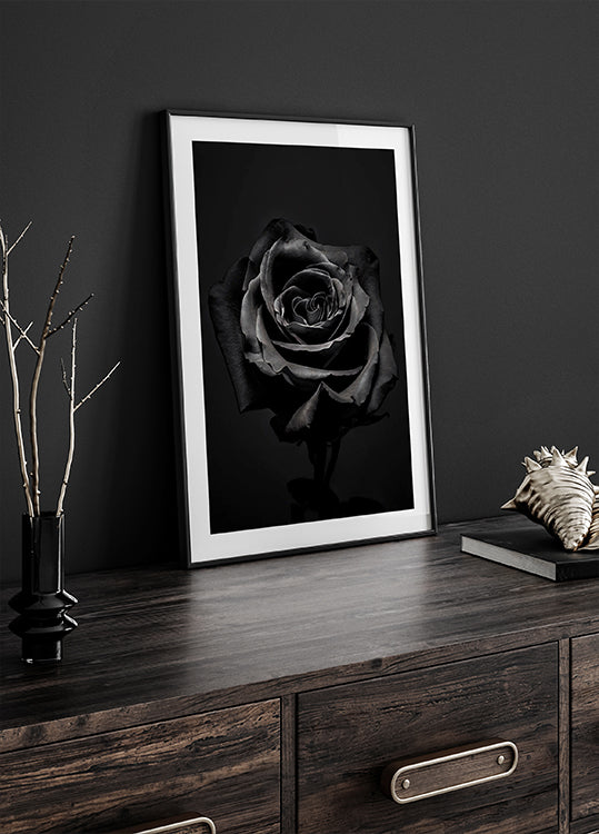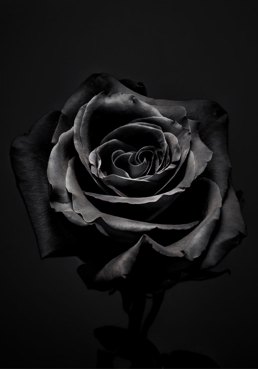 Um impressionante close-up de uma rosa negra contra um fundo escuro, simbolizando mistério, elegância e força. Esta arte floral dramática é perfeita para interiores modernos, góticos e minimalistas.