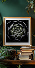 Um close hipnótico de uma roseta Sempervivum, as folhas se desenrolando em perfeita simetria e tons verdes profundos contra um fundo escuro e tranquilo. A ordem geométrica encontra a poesia orgânica e cria um efeito gráfico e calmo. Fotografia de Victor Mozqueda, ideal para espaços modernos. O contraste realça a arquitetura e a tranquilidade da planta.