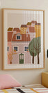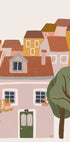 Uma vista atmosférica da rua a partir de Lisboa capta a paleta quente da cidade: fachadas rebocadas em amarelo mostarda, rosa e terracota, banhadas por luz suave. Ruas estreitas, varandas e arquitetura clássica europeia criam uma atmosfera boêmia que exala a alegria da viagem, nostalgia e tranquilidade. Perfeito como um atrativo calmo e prático para casa e escritório.