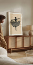 Uma graciosa silhueta preta de uma bailarina no meio de uma pirueta, com o vestido listrado fluindo em movimentos elegantes. O fundo bege suave e o forte contraste conferem a esta peça um toque atemporal e elegante - perfeita para adicionar movimento artístico à sala de estar, estúdio ou parede de galeria.