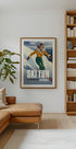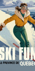 Um pôster de viagem de inspiração retrô de Andreas Magnusson: Um esquiador dinâmico em uma parka colorida corta a neve na pista, enquanto as montanhas majestosas de Quebec e as florestas escuras de pinheiros surgem ao fundo. Formas nítidas e gráficas e cores vintage suaves capturam o clima fresco do inverno nórdico para a aventura.