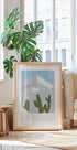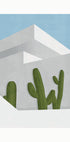 Uma estética moderna do deserto ganha vida nesta ilustração minimalista com altos cactos verdes emoldurados por linhas arquitetônicas limpas e um céu azul calmo. A interação entre luz, sombra e geometria captura um momento de pátio iluminado pelo sol – um pôster impressionante para interiores modernos e inspirados na natureza.