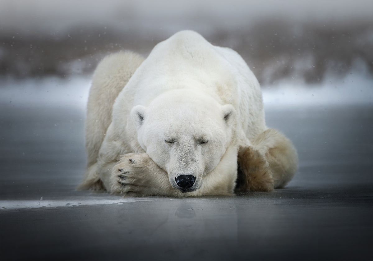 Uma fotografia pacífica da natureza mostrando um urso polar descansando calmamente no gelo com os olhos fechados em profundo repouso. A composição evoca temas como mindfulness, espiritualidade e a ligação sagrada entre a natureza e o silêncio. Um forte lembrete da força e da vulnerabilidade da natureza.
