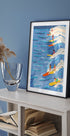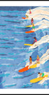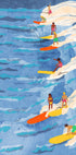 Uma ilustração animada e colorida de surfistas surfando nas ondas em longboards, capturando a energia despreocupada do verão e da vida marinha. Com cores fortes e movimento dinâmico, esta peça celebra os desportos aquáticos, as viagens e o lazer e enquadra-se perfeitamente em interiores de inspiração costeira ou retro surf.