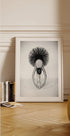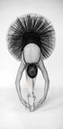 Uma impressionante fotografia em preto e branco de uma bailarina em uma graciosa posição de alongamento. Capturada de cima, a dançarina se equilibra na ponta dos pés com os braços elegantemente estendidos em direção ao chão, enquanto o tutu forma uma moldura circular perfeita. A obra de arte celebra a disciplina, a elegância e o equilíbrio do balé clássico.