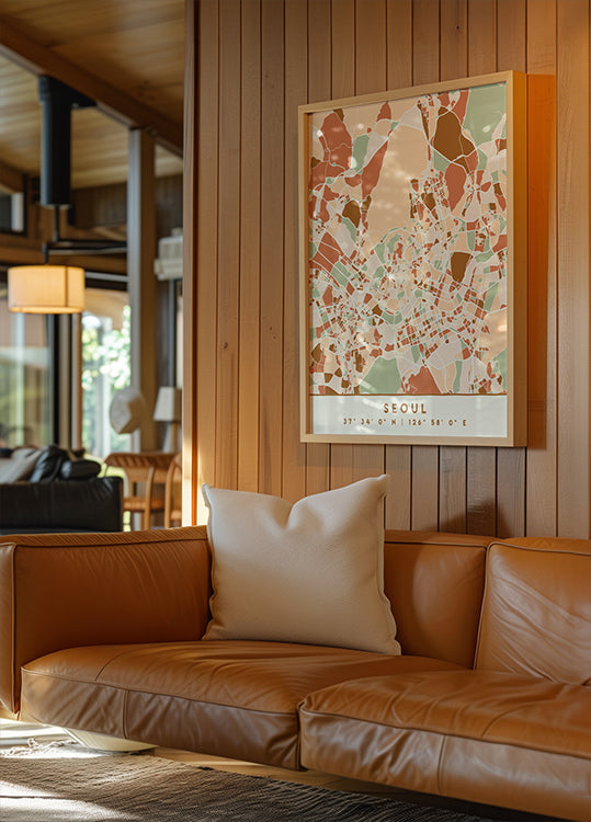 Um mapa elegante e escuro de Seul em tons de terra, onde a rede de ruas, bairros e contornos da cidade se destacam em gráficos detalhados. A paleta suave confere uma expressão calma e moderna que se adapta tanto à sala de estar como ao escritório. Parte da série Black Maps Earth Tones, criada por Emiliano Deificus. Perfeito para amantes de mapas e interiores urbanos.