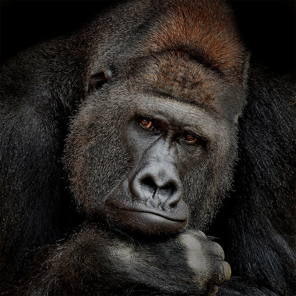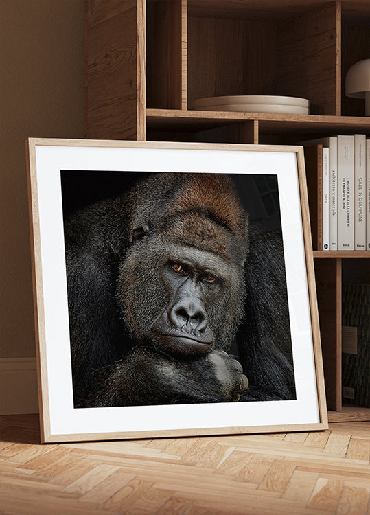 Um pôster intenso e discreto de um majestoso gorila de dorso prateado capturado em um momento de contemplação silenciosa. Os olhos profundos e sábios encontram os seus e criam presença, vulnerabilidade e força ao mesmo tempo. As sombras realçam as características distintivas e conferem ao motivo uma calma escultural e intemporal. Por Antje Wenner-Braun. O título é UM MOMENTO EM CONTATO.