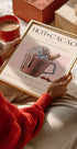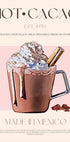 Uma xícara fumegante de chocolate quente cremoso é o centro das atenções em uma ilustração de inspiração retrô de Nazma Khokhar. Tons quentes de marrom, reflexos cremosos e tons suaves de rosa criam uma atmosfera aconchegante e vintage de café. A tipografia elegante e uma referência sutil dos anos 1950 sugerem uma estética clássica de pôster de café com um toque da tradição mexicana do cacau.