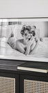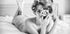 Um elegante pôster em preto e branco que captura um retrato de inspiração retrô de uma mulher com cachos de cabelo vintage, deitada elegantemente em uma cama enquanto segura uma câmera clássica. Com uma mistura de sensualidade, nostalgia e expressão artística, a fotografia celebra a atração feminina e o glamour atemporal.