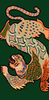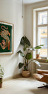 Uma impressionante ilustração abstrata de um tigre estilizado em cores vibrantes, contra um fundo verde forte. A obra de arte combina padrões geométricos, linhas fluidas e texturas vibrantes para criar uma interpretação moderna do espírito felino. Uma obra de arte única inspirada em animais para os amantes do design moderno.