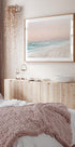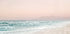 Uma fotografia costeira tranquila que captura ondas azul-turquesa batendo suavemente em uma praia sob um céu nebuloso em tons pastéis. As montanhas distantes criam um horizonte de sonho que evoca tranquilidade e um clima de férias.