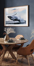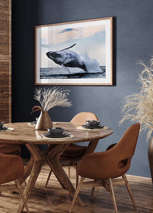 Um pôster fotográfico de tirar o fôlego capturando uma baleia jubarte quebrando dramaticamente acima da superfície do oceano. O salto poderoso, apanhado no ar com salpicos de água, mostra o poder majestoso da natureza. Perfeito para amantes de animais, paisagens marítimas e para aqueles que amam as impressionantes maravilhas da natureza.