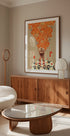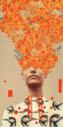 Uma colagem digital surreal que combina retrato, pássaros e uma explosão vibrante de flores laranja. A obra de arte combina ilustrações botânicas e ornitológicas vintage com o surrealismo moderno e simboliza a harmonia entre o homem e a natureza. Os tons quentes do outono tornam-no um elemento marcante tanto em interiores ecléticos como modernos.