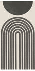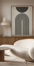 Uma estampa abstrata minimalista inspirada no estilo de meados do século com arcos pretos ousados que se estendem em direção a um círculo preto sólido. A simplicidade geométrica das linhas e o equilíbrio circular tornam esta obra de arte uma peça atraente de decoração de parede moderna.