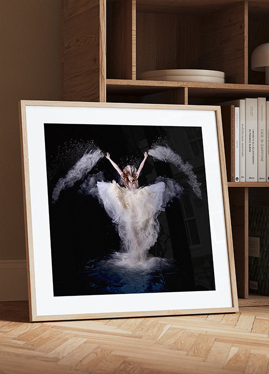 Powder Rush de Pauline Pentony captura o momento em que uma dançarina explode em movimento, cercada por uma nuvem de pólvora que forma asas de anjo. O fundo escuro e dramático eleva a figura brilhante, enquanto o salto, o vestido e o pó de penas criam poesia, poder e aventura. Um retrato moderno e aventureiro.
